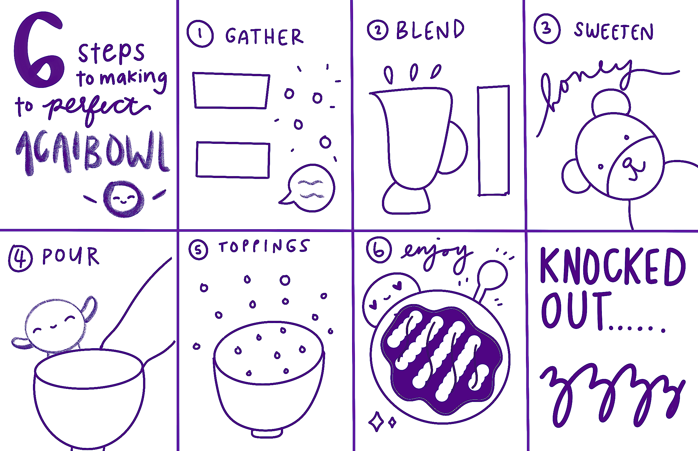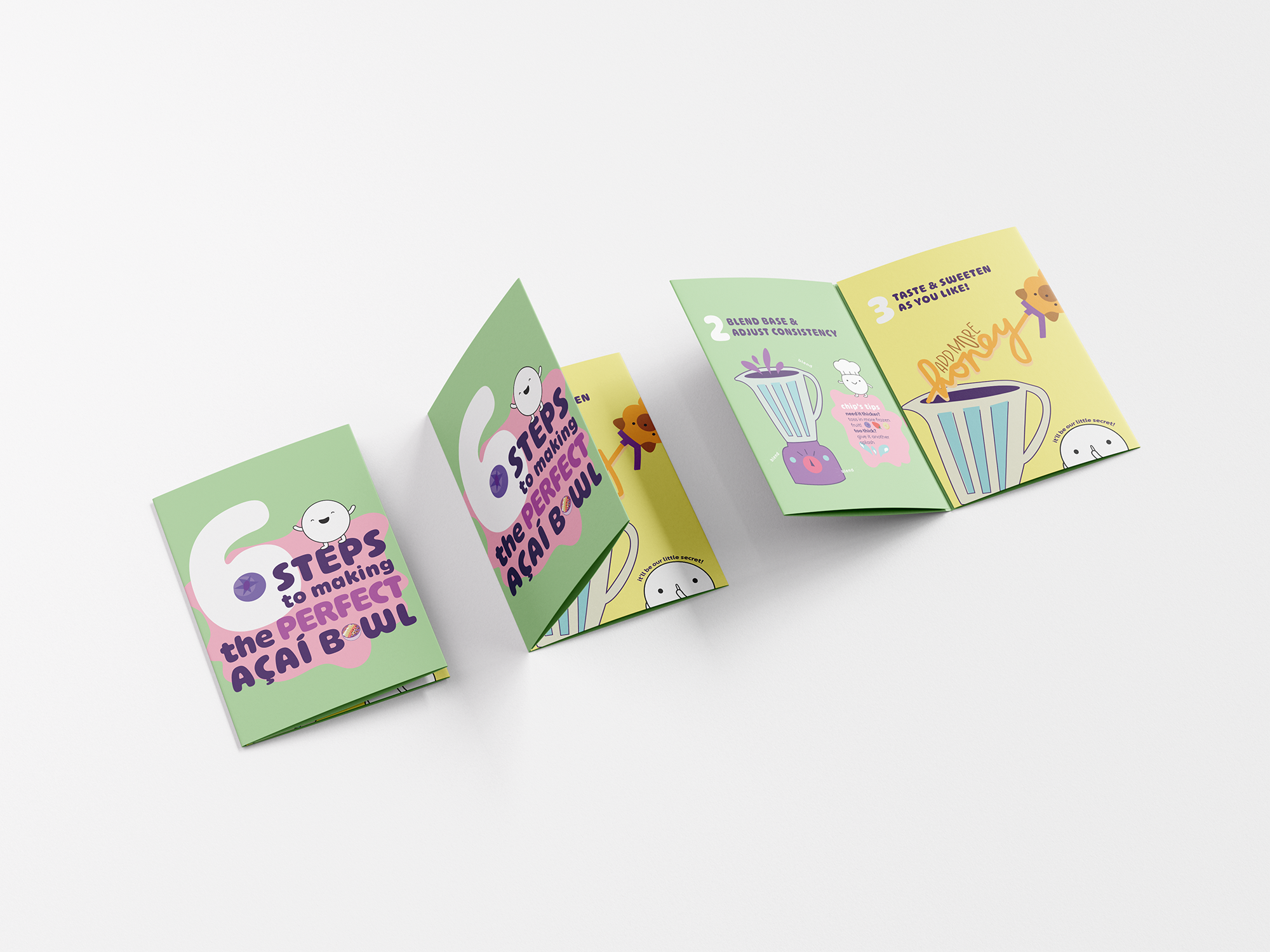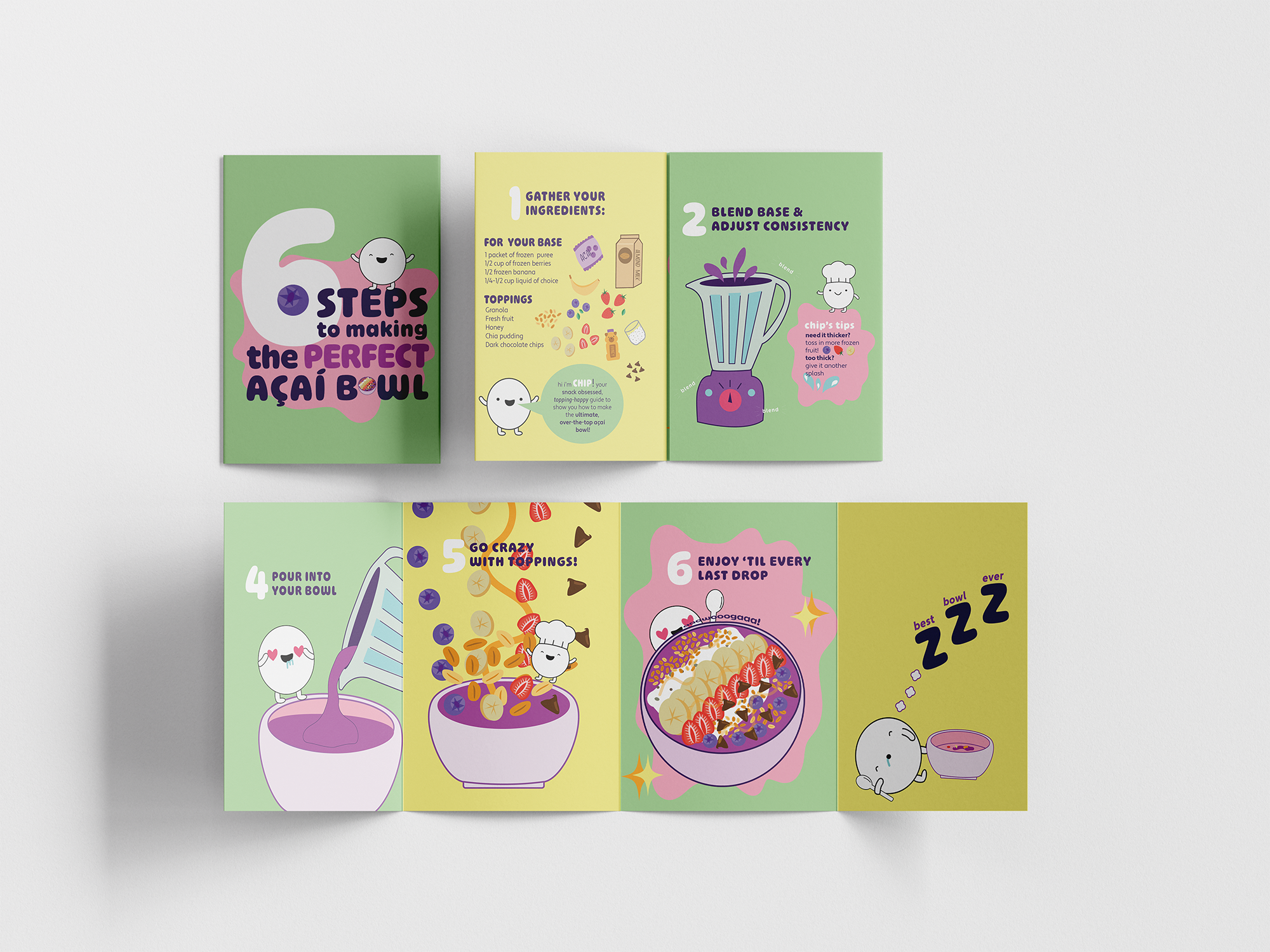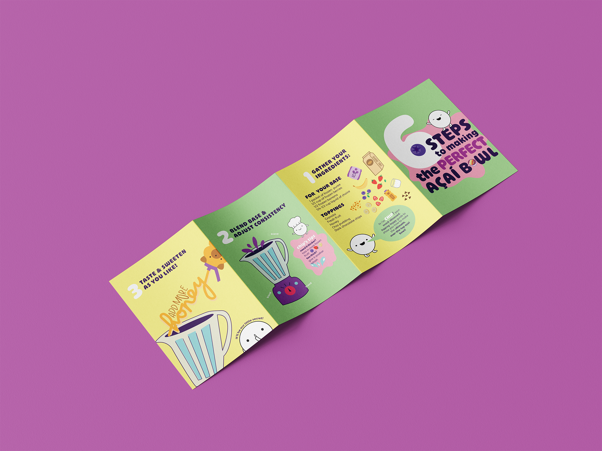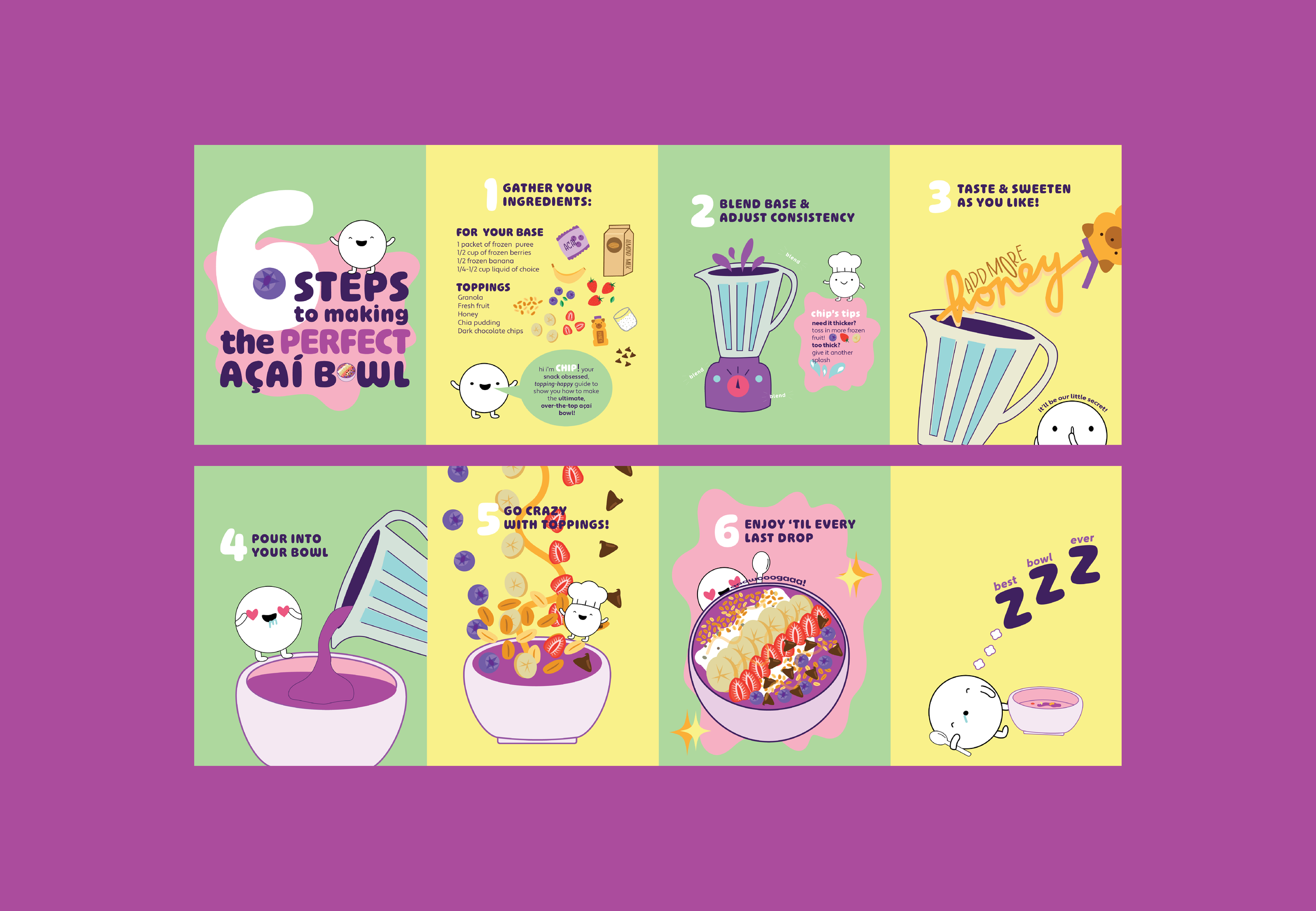 Chip is a playful mini mascot created to turn the process of building an açaí bowl into a fun, guided experience. The goal of this project was to make something instructional feel exciting and easy to follow, so I designed a six-step system using simple, expressive icons led by Chip’s personality. Each step breaks down the process in a way that feels approachable, while still encouraging creativity and customization.