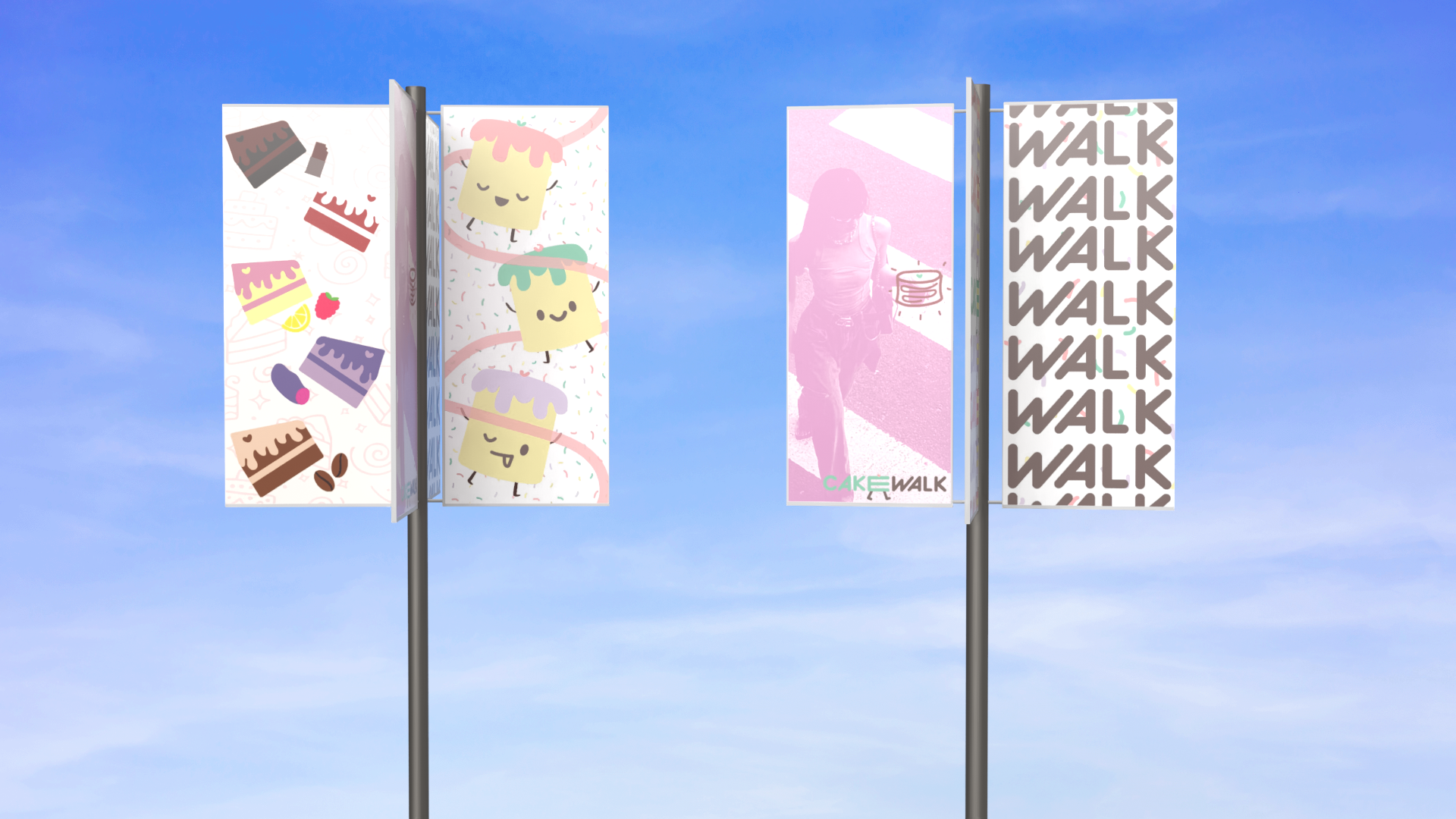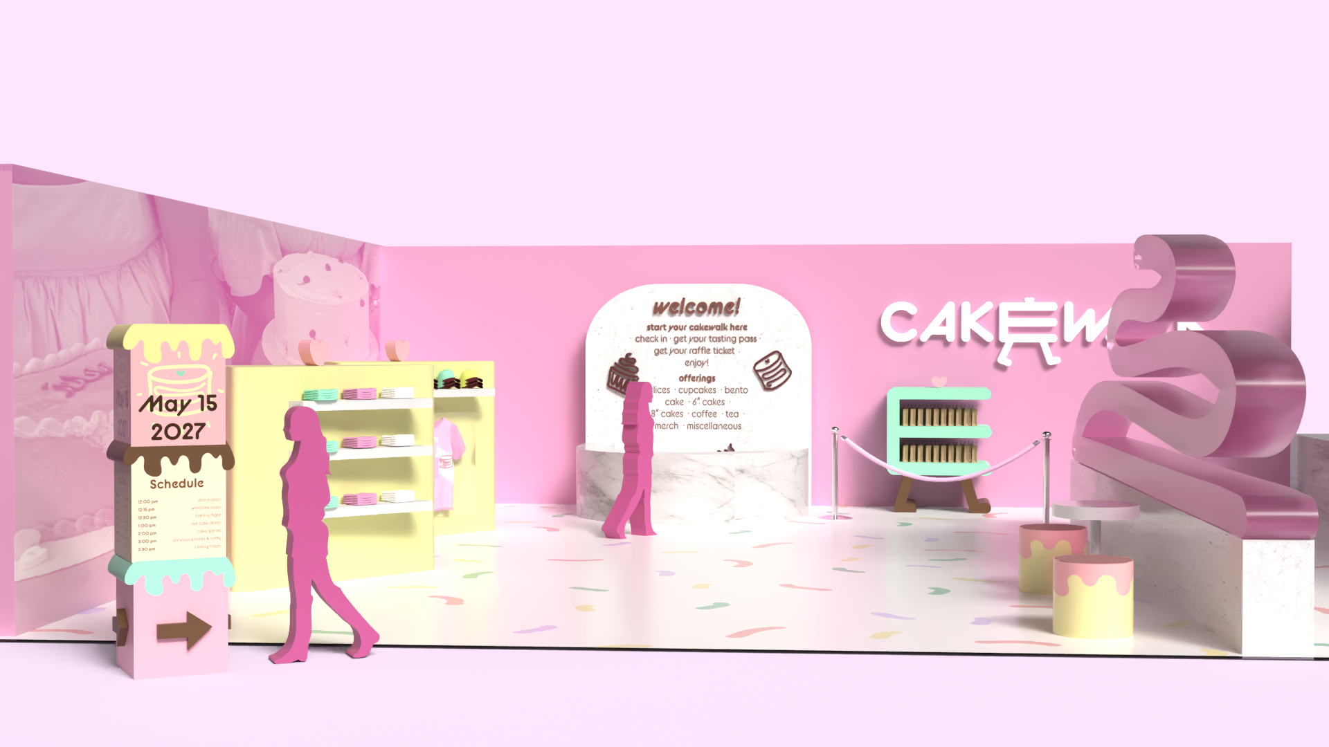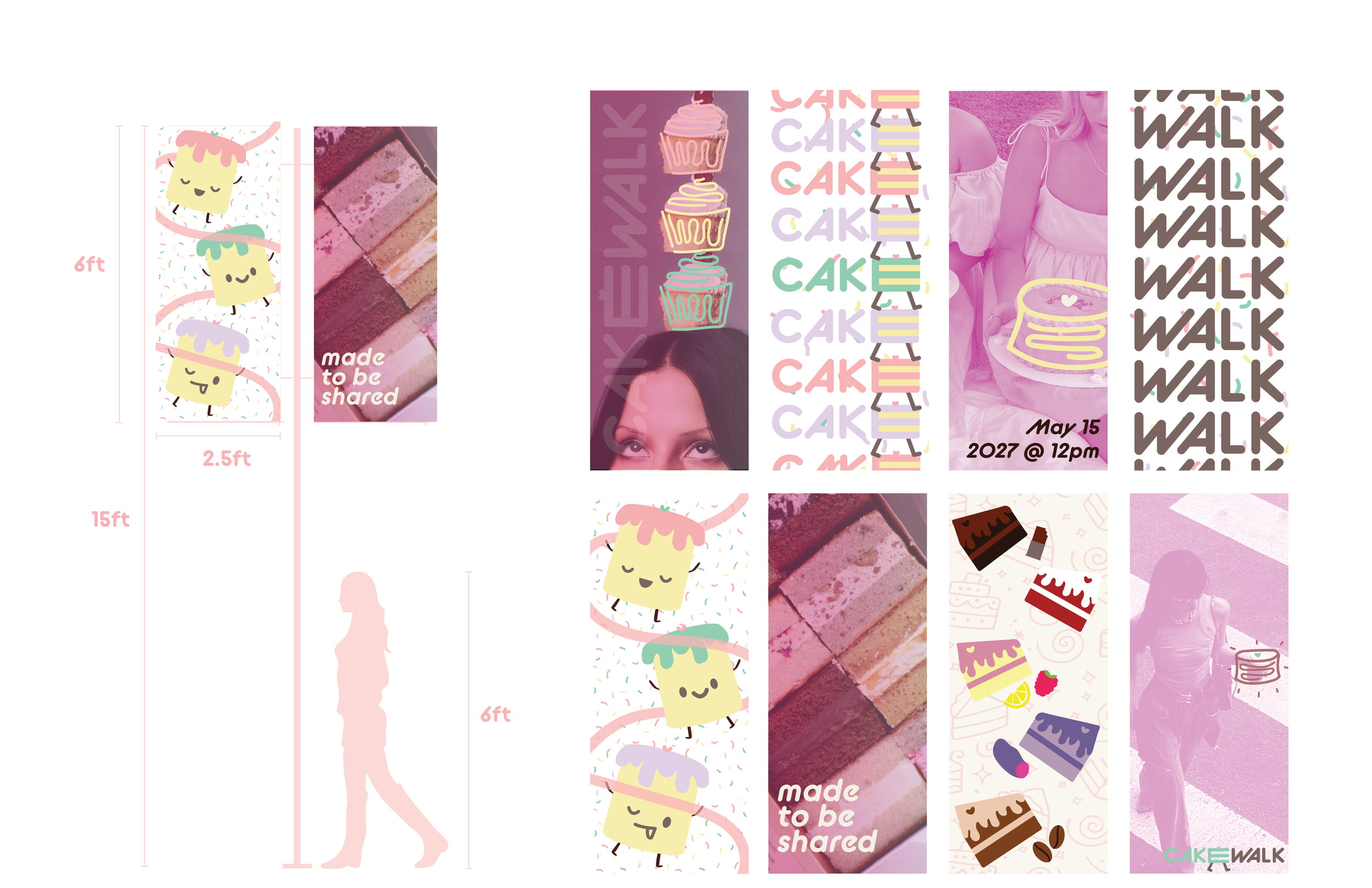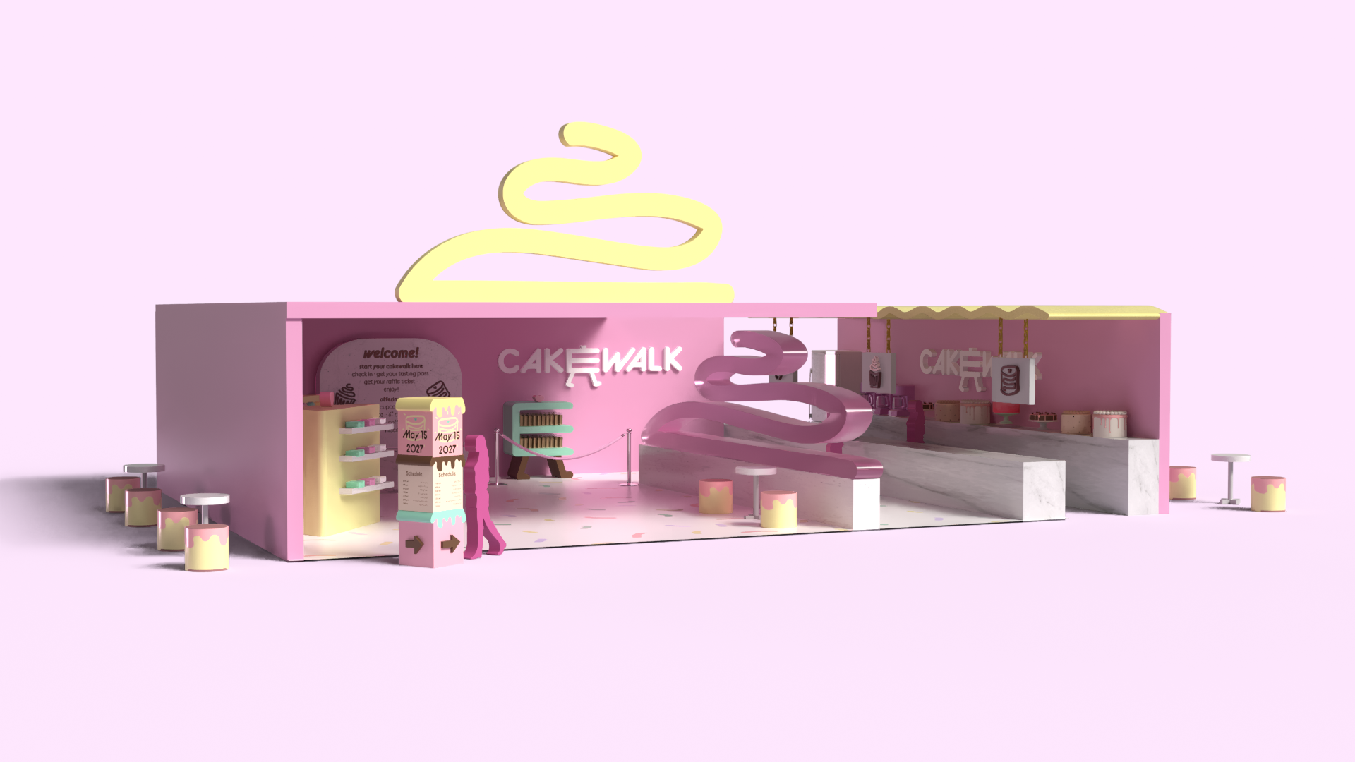 Cakewalk is an immersive dessert tasting pop-up that reimagines cake sampling as a cohesive, brand-driven experience. Designed for young, food-focused audiences, the concept draws from nostalgic birthday imagery and soft pastel material palettes to create a playful yet structured environment optimized for engagement and social sharing.
