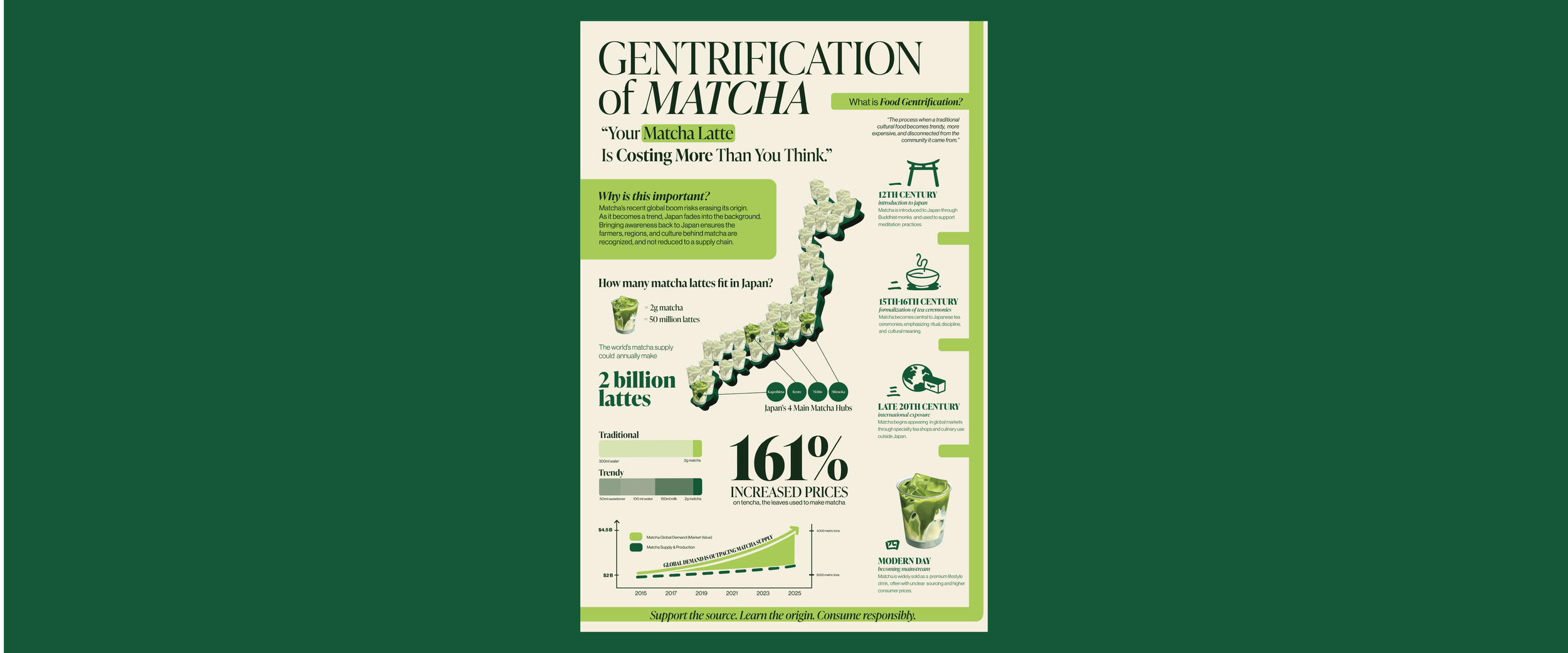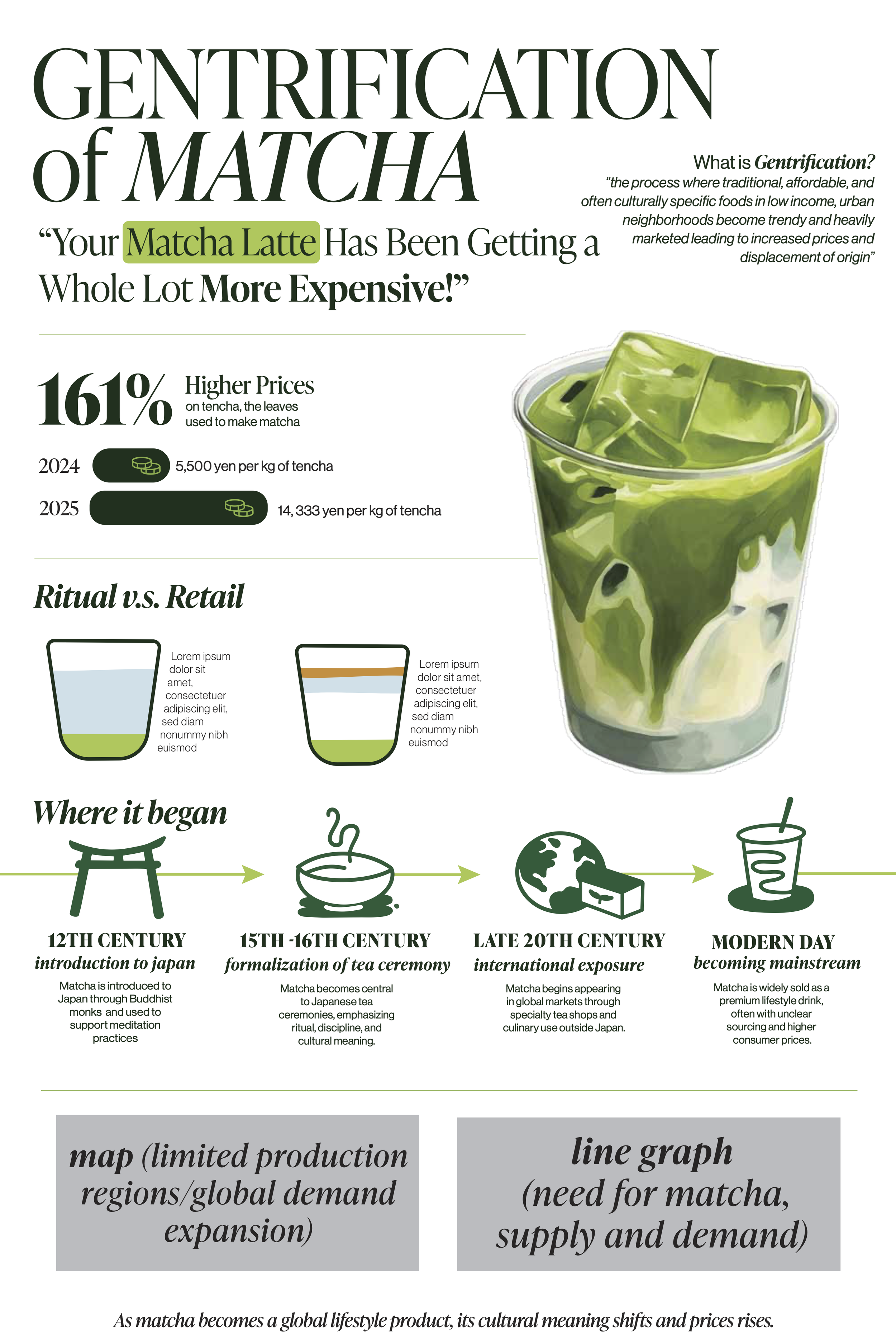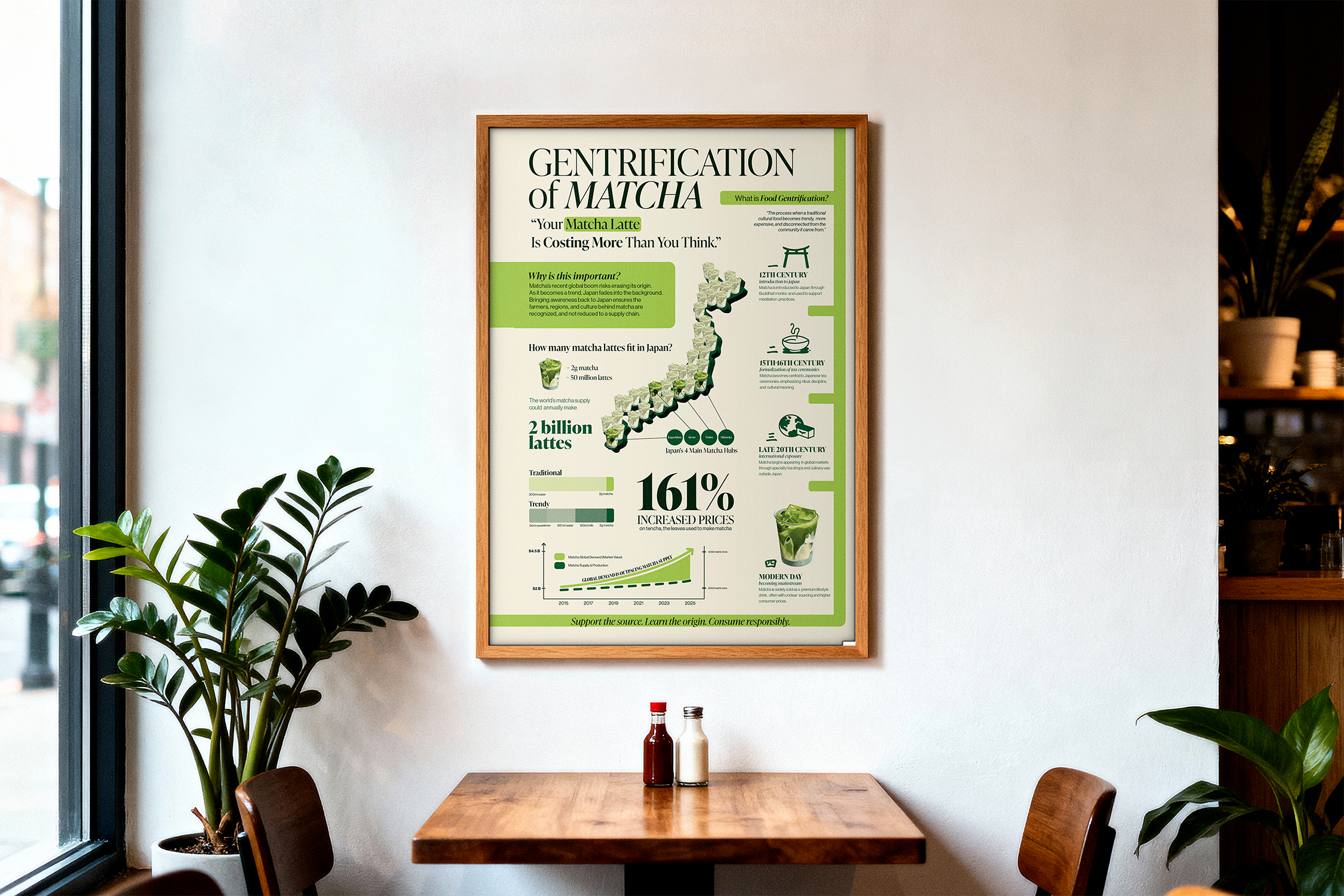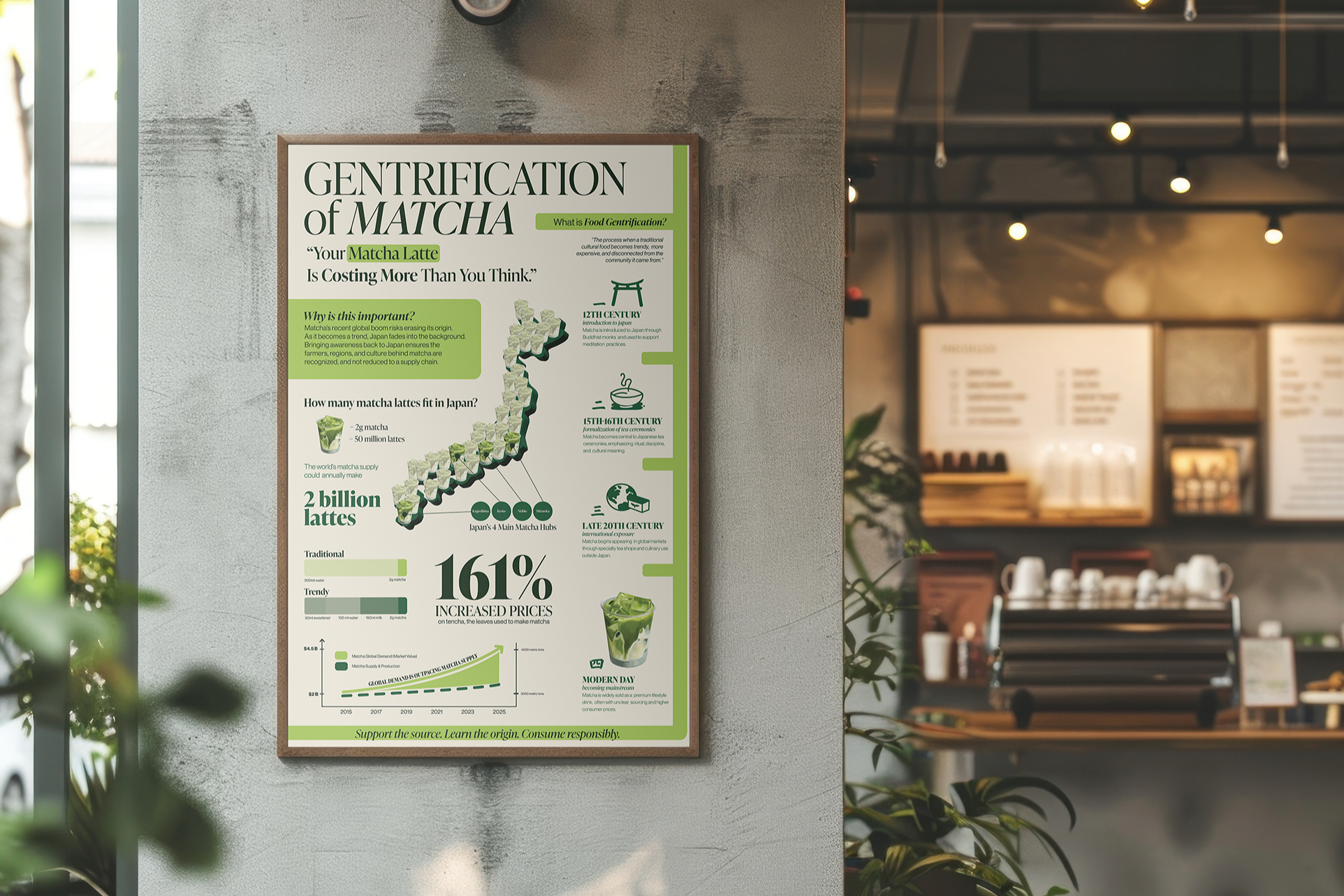 This project explores the gentrification of matcha as global demand turns a traditional Japanese drink into a trendy café product. My goal was to bring attention back to where matcha comes from and the regions in Japan that produce it. I turned my research into infographic visuals then adapted the poster into an interactive digital design with clickable hotspots that reveal more information and allow viewers to explore the data step by step. Through this project, I learned how to organize complex research into clear visual systems and how interaction can help audiences better understand the story behind a product.