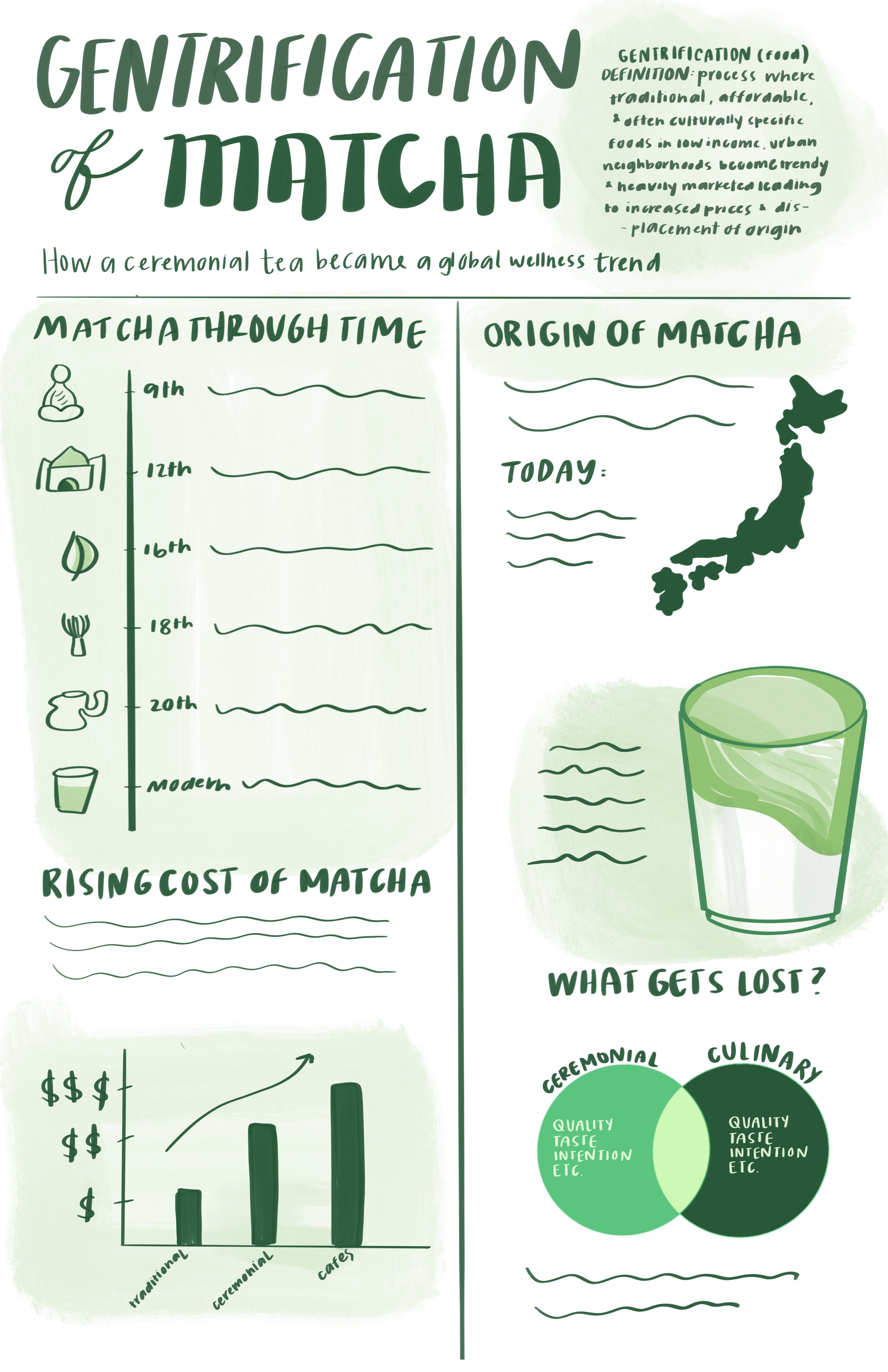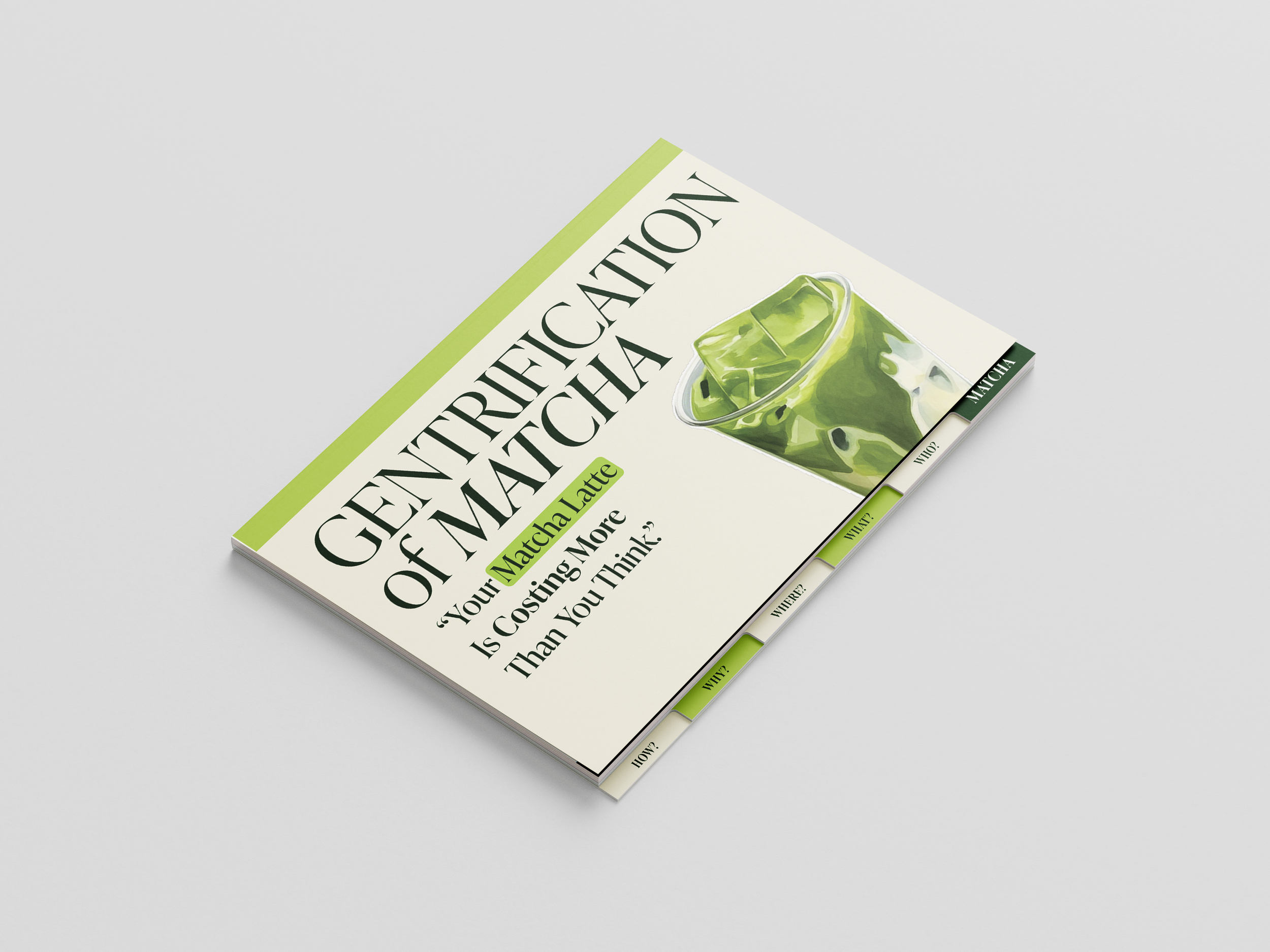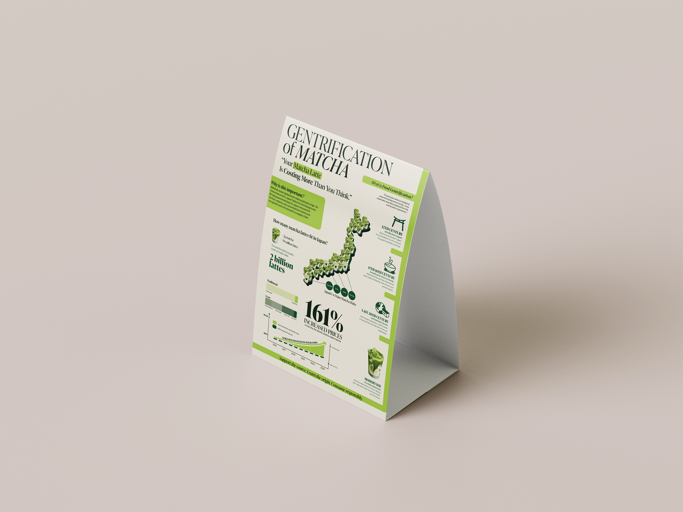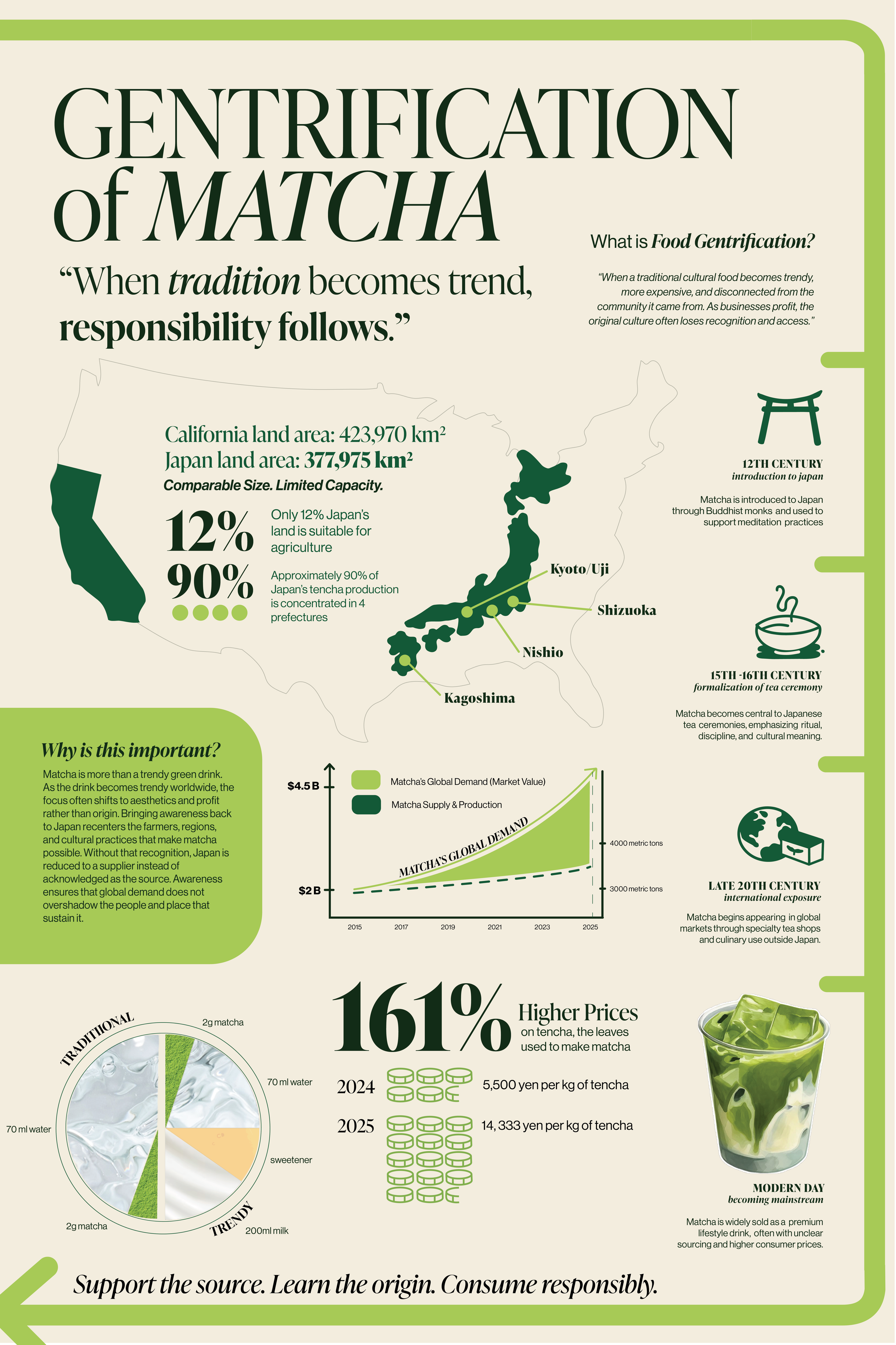 This project explores the gentrification of matcha as global demand turns a traditional Japanese drink into a trendy café product. My goal was to bring attention back to where matcha comes from and the regions in Japan that produce it. I turned my research into infographic visuals then adapted the poster into an interactive digital design with clickable hotspots that reveal more information and allow viewers to explore the data step by step. Through this project, I learned how to organize complex research into clear visual systems and how interaction can help audiences better understand the story behind a product.