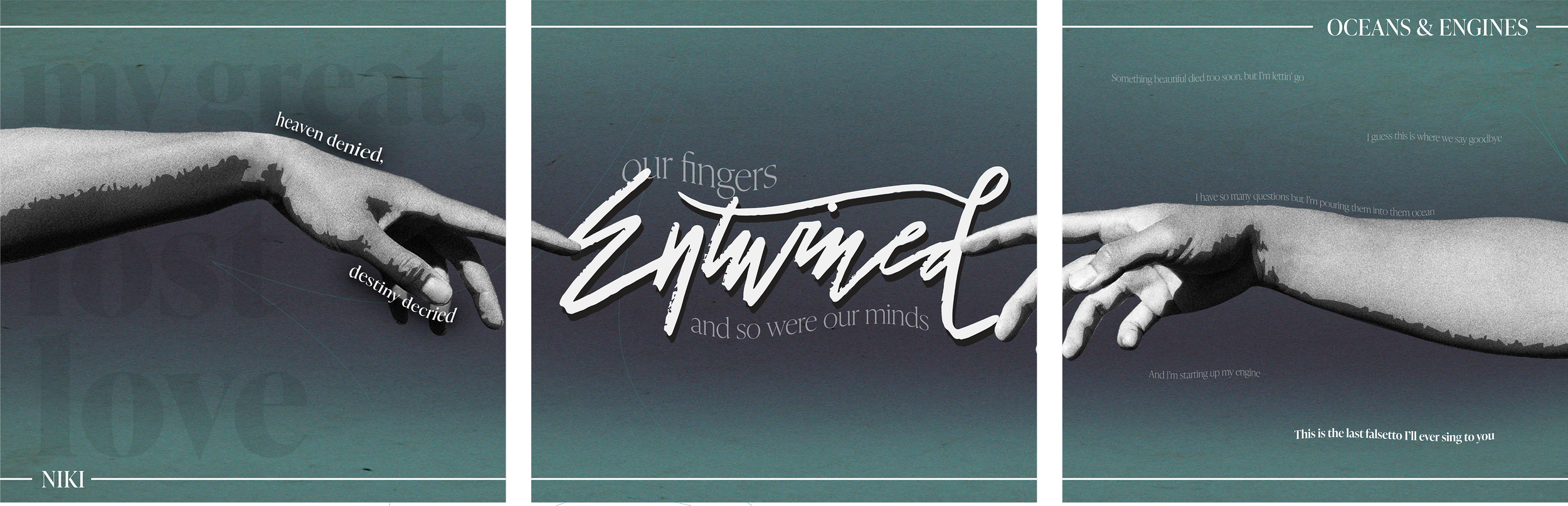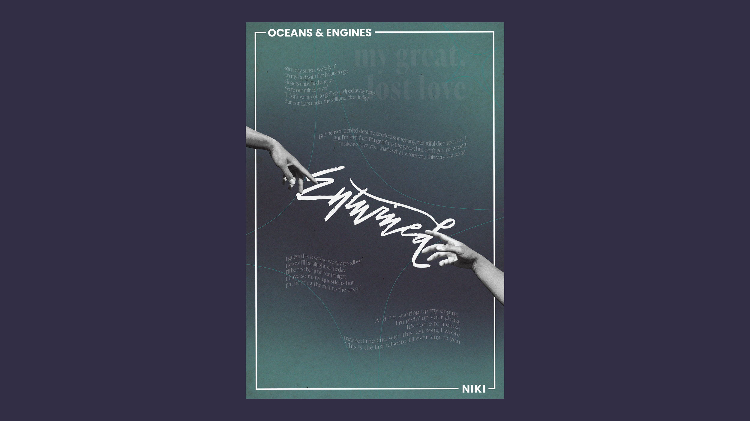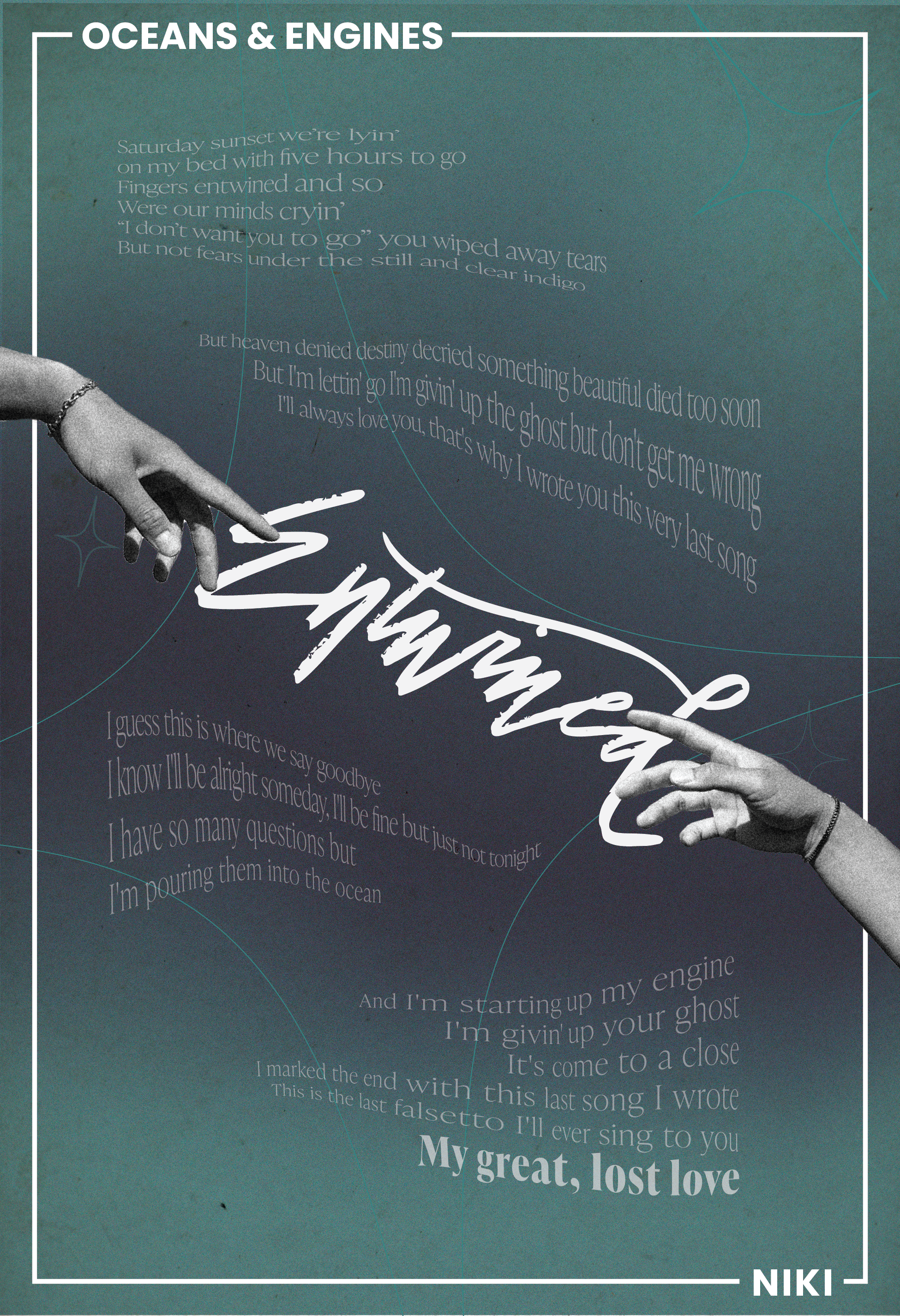 Based on a song near and dear to my heart, this broadside poster draws inspiration from NIKI’s Oceans & Engines. It captures the raw emotion of love and loss, blending fluid typography with bold elements to mirror the lyrics’ theme of connection and separation. The hands reaching out, inspired by The Creation of Adam, symbolize the fragility of fleeting moments. The design amplifies the heartache of letting go, turning the song’s poignant farewell into a visual experience.