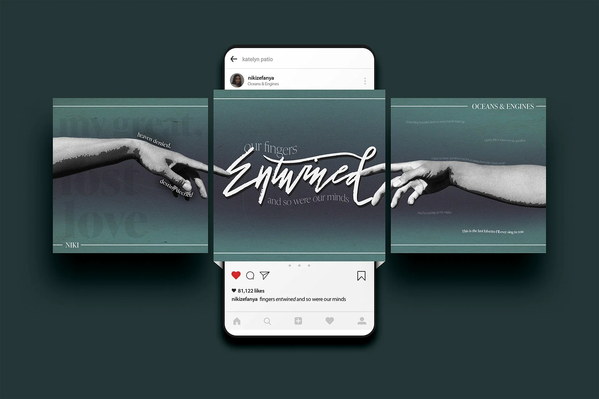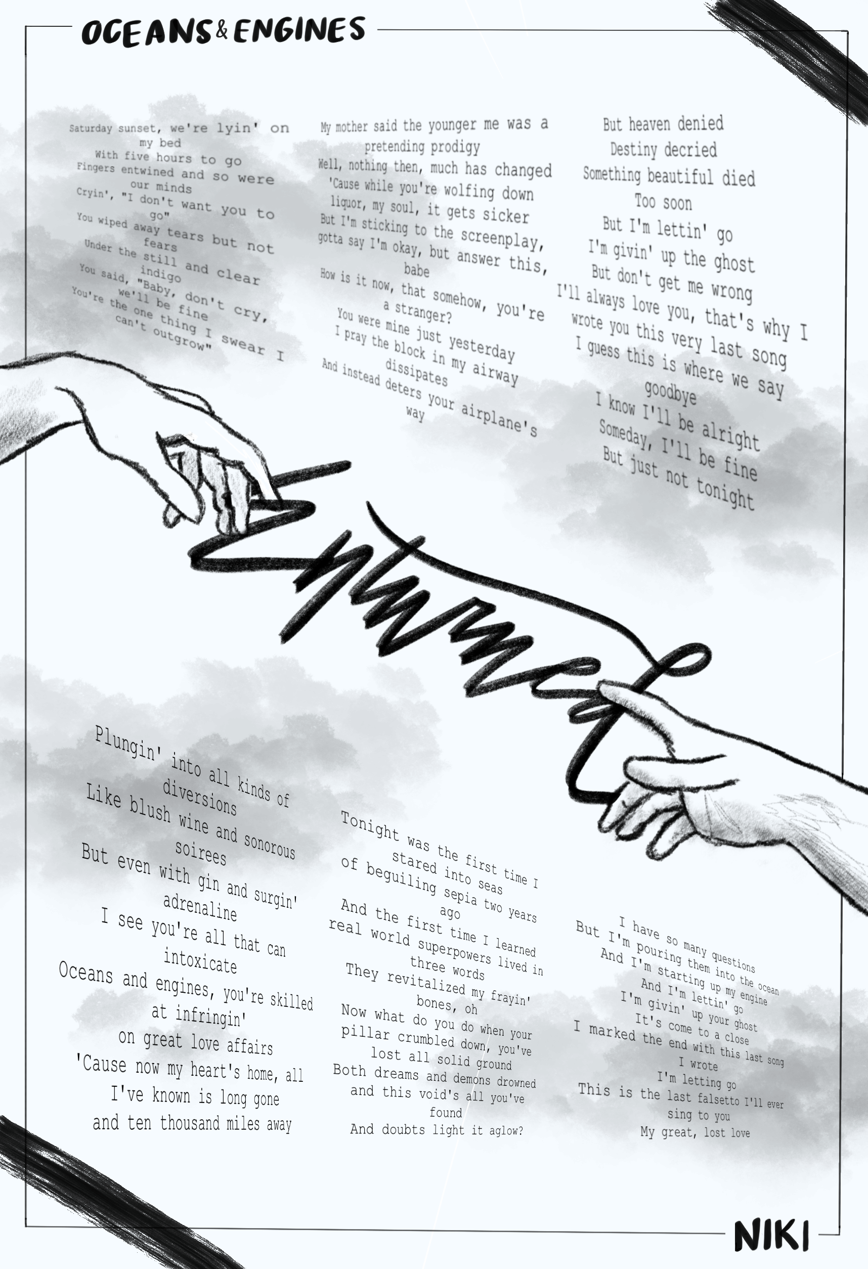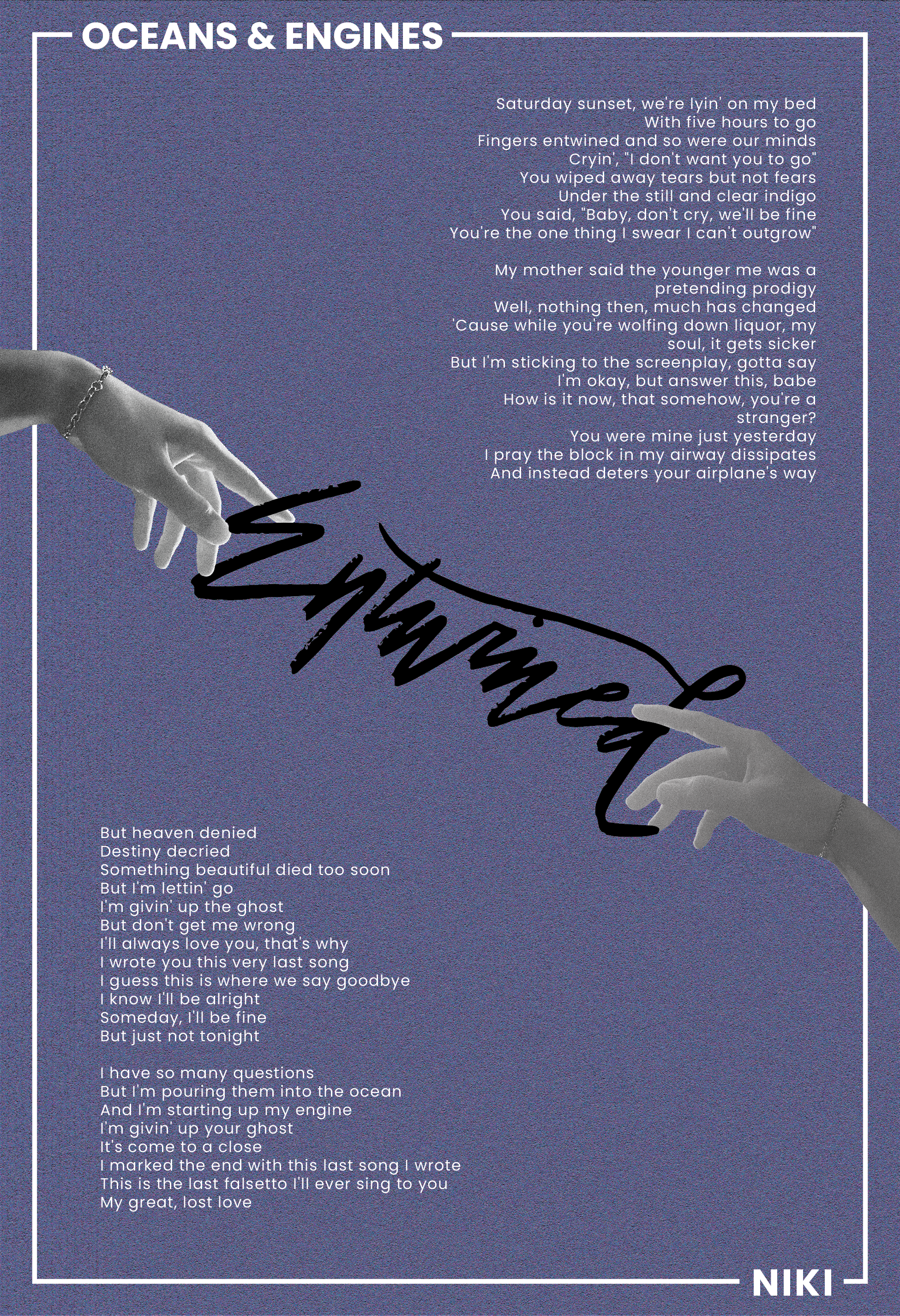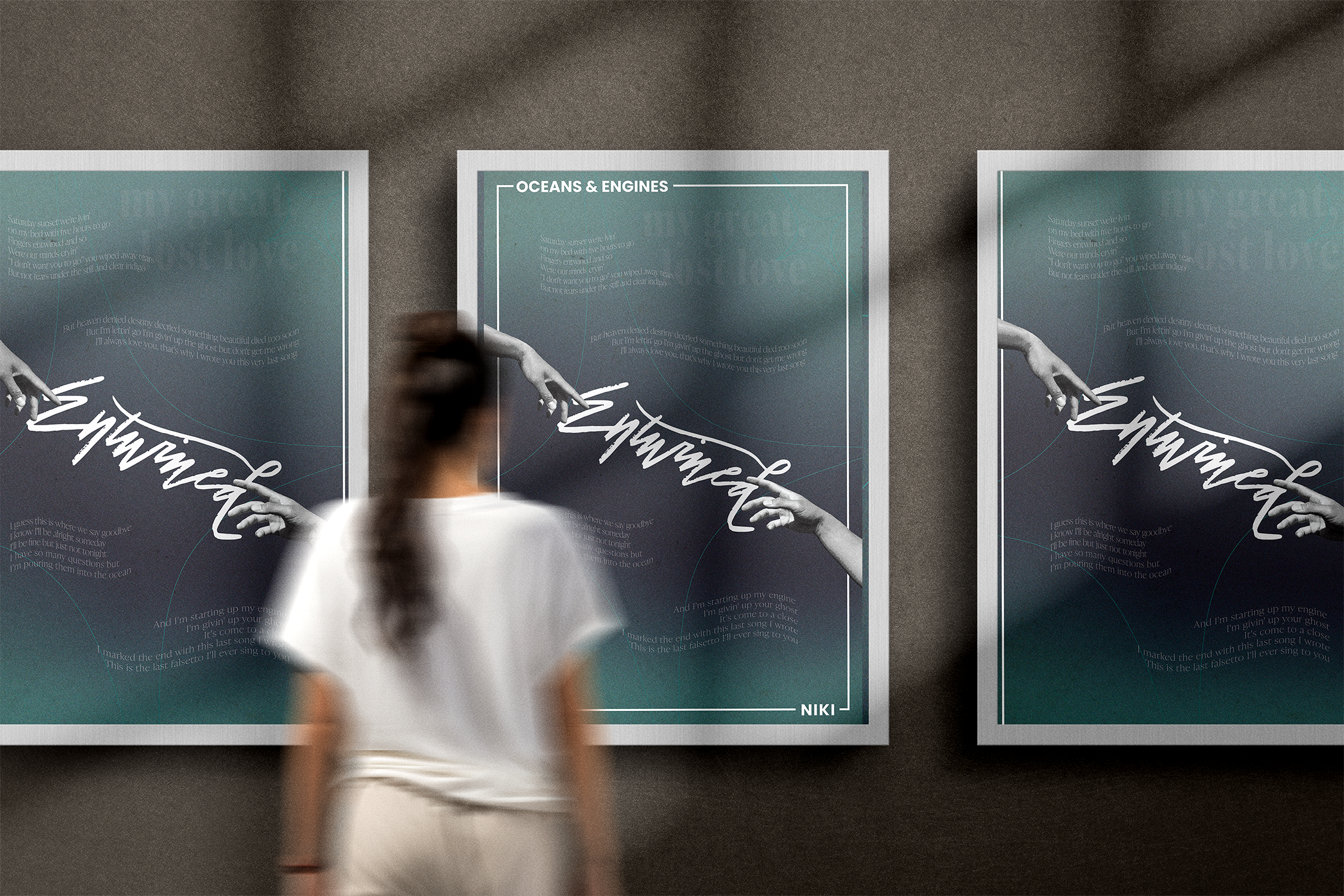 Based on a song near and dear to my heart, this broadside poster draws inspiration from NIKI’s Oceans & Engines. It captures the raw emotion of love and loss, blending fluid typography with bold elements to mirror the lyrics’ theme of connection and separation. The hands reaching out, inspired by The Creation of Adam, symbolize the fragility of fleeting moments. The design amplifies the heartache of letting go, turning the song’s poignant farewell into a visual experience.